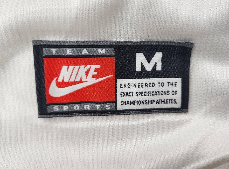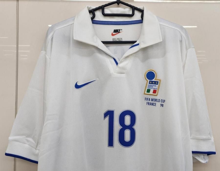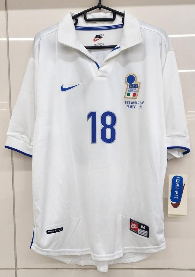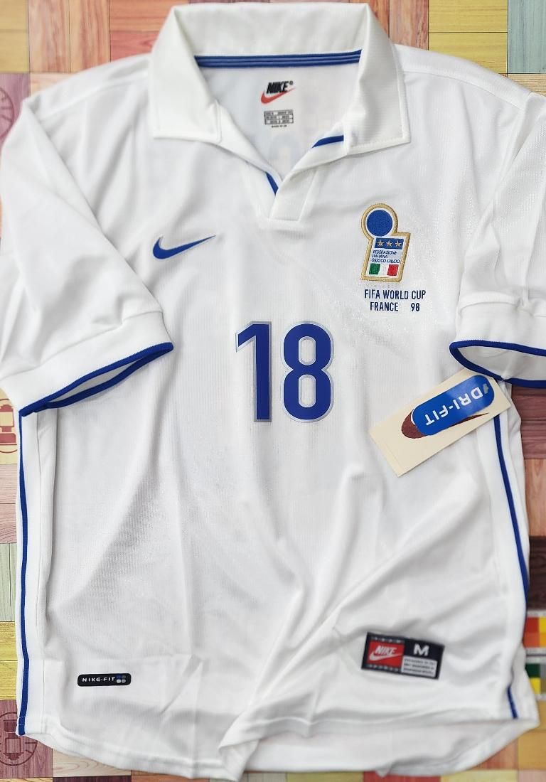NIKE社製 イタリア(A)1998 フランスW杯 BAGGIO R,#18 + WC 98 胸プリント。 新品、未使用、紙タグ付きのデッドストックユニフォームでございます! 右胸のNIKEスヲッシュは刺繍、左胸のクレストも刺繍ワッペン型。 サイドラインにブルーのパイピング。 BAGGIO R,#10のマーキング付き。 左胸のクレスト下に FIFA WORLD CUP98FRANCEのプリント入。 ベスト16のチリ戦などでAWAYは着用されました。