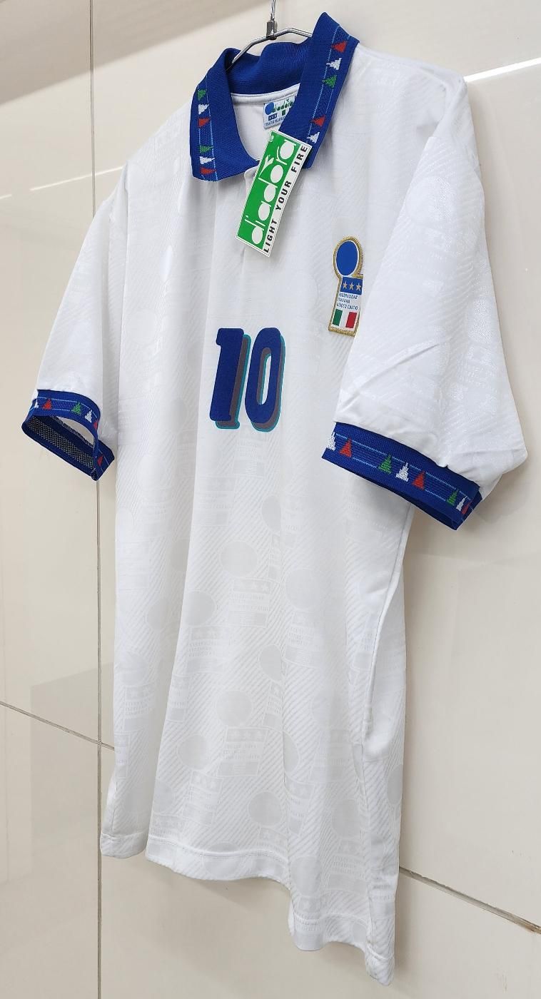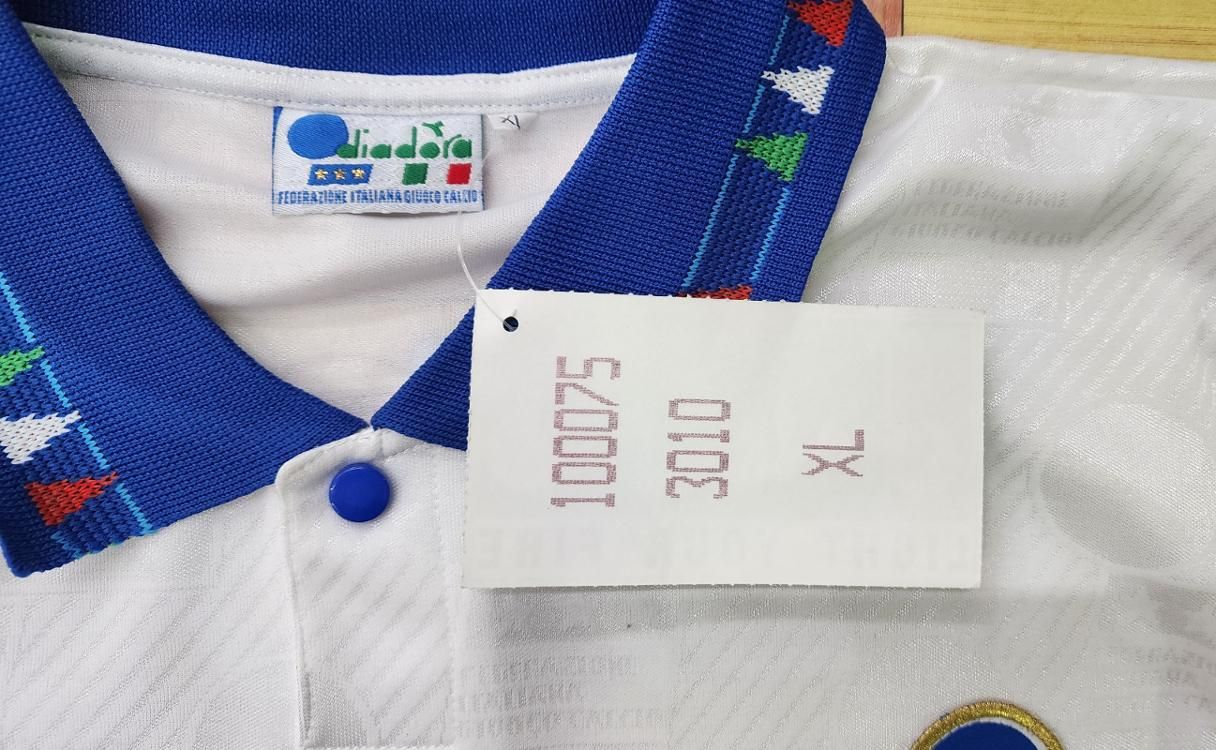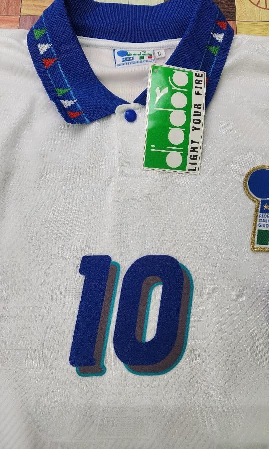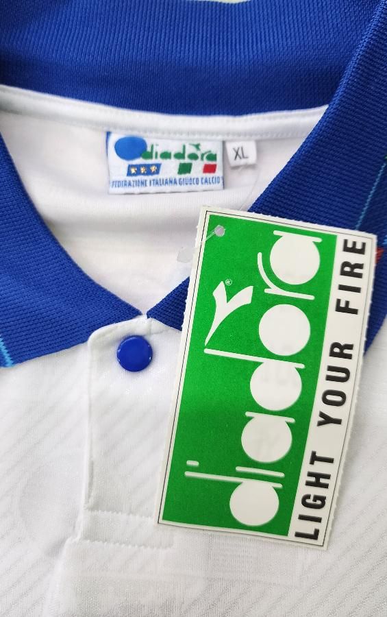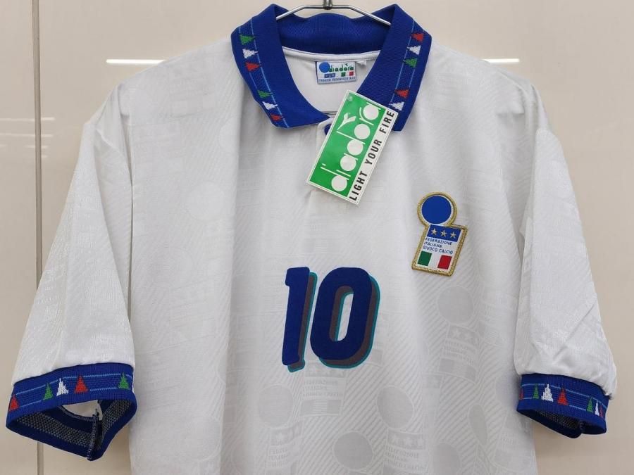 diadora社製 イタリア代表(A)1994 W杯 R,バッジョ#10 新品、未使用、紙タグ付きのデッドストックユニフォームでございます! 生地全体にクレスト模様が織り込まれております。 左胸のクレストは金刺繍のワッペン型です。 襟元にボタンが付いております。 襟周り、袖口は三色のイタリアカラーのデザインになります。 フロック素材3色の背番号、胸番号になります。 アメリカ94W杯で着用モデルでございます。当時物でございます。復刻ではございません。