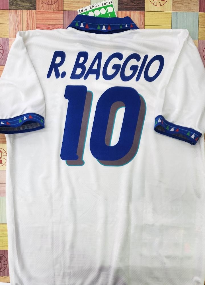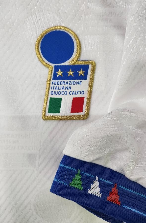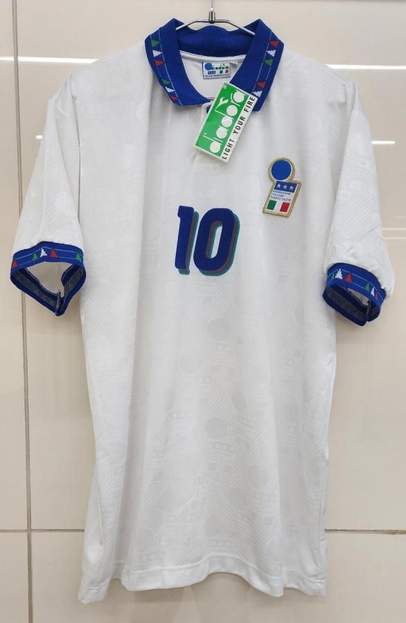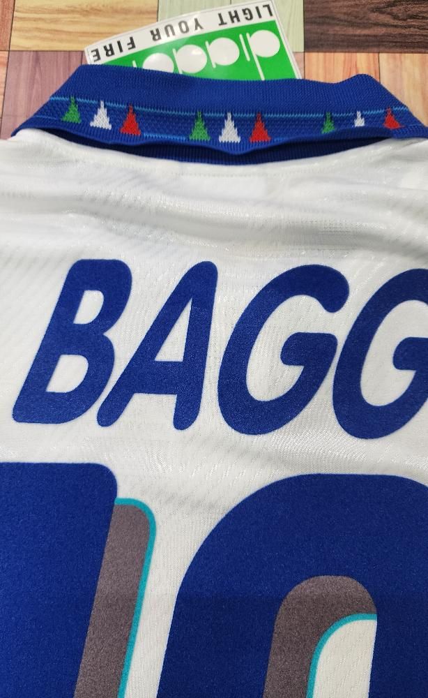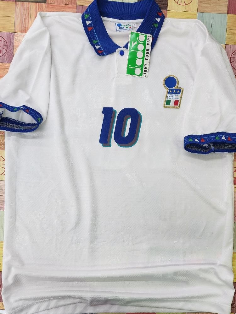 diadora社製 イタリア代表(A)1994 W杯 R,バッジョ#10 新品、未使用、紙タグ付きのデッドストックユニフォームでございます! 生地全体にクレスト模様が織り込まれております。 左胸のクレストは金刺繍のワッペン型です。 襟元にボタンが付いております。 襟周り、袖口は三色のイタリアカラーのデザインになります。 フロック素材3色の背番号、胸番号になります。 アメリカ94W杯で着用モデルでございます。当時物でございます。復刻ではございません。