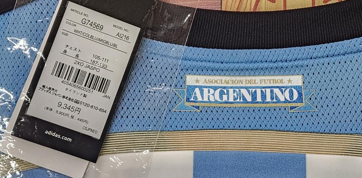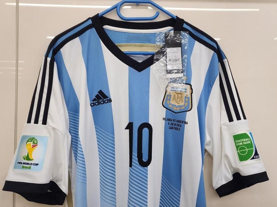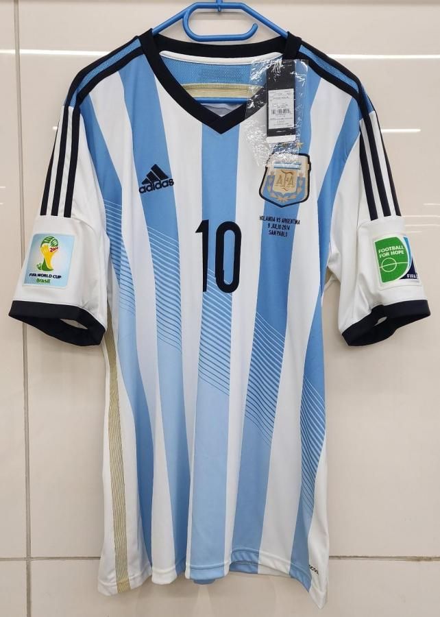 adidas社製 アルゼンチン代表(H)2014W杯 メッシ#10 + パッチ & マッチデイ! 新品、未使用、紙タグ付きになります! 2014年 ブラジルワールドカップ 準決勝vsオランダの マッチデイが左胸に付いております! ※※当時のアルゼンチン代表はドイツ、スペイン、日本などadidasグローバルの一般的に発売されていたオフィシャル25cmサイズ背番号ではなくアルゼンチン国内製造のオリジナル27cm+αサイズ\の大きな背番号で試合を行っておりました。背番号に透かし柄もなく黒ベタの背番号にて試合を行っております。 今回の商品も27cm+αの大きく太い選手用サイズ黒ベタのマーキングを使用しておりますので メッシ、オランダ戦の写真と同じ様にストライブ柄に沿ったバランス良い圧着が可能になります。 ※ちなみに通常のオフィシャル25cmサイズの短く細い番号ですと写真の様なバランスにはなりません。 左右袖にフロック素材2014W杯パッチ付き。