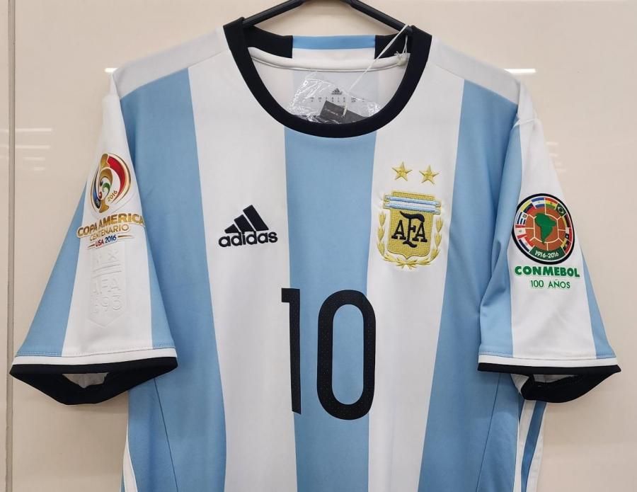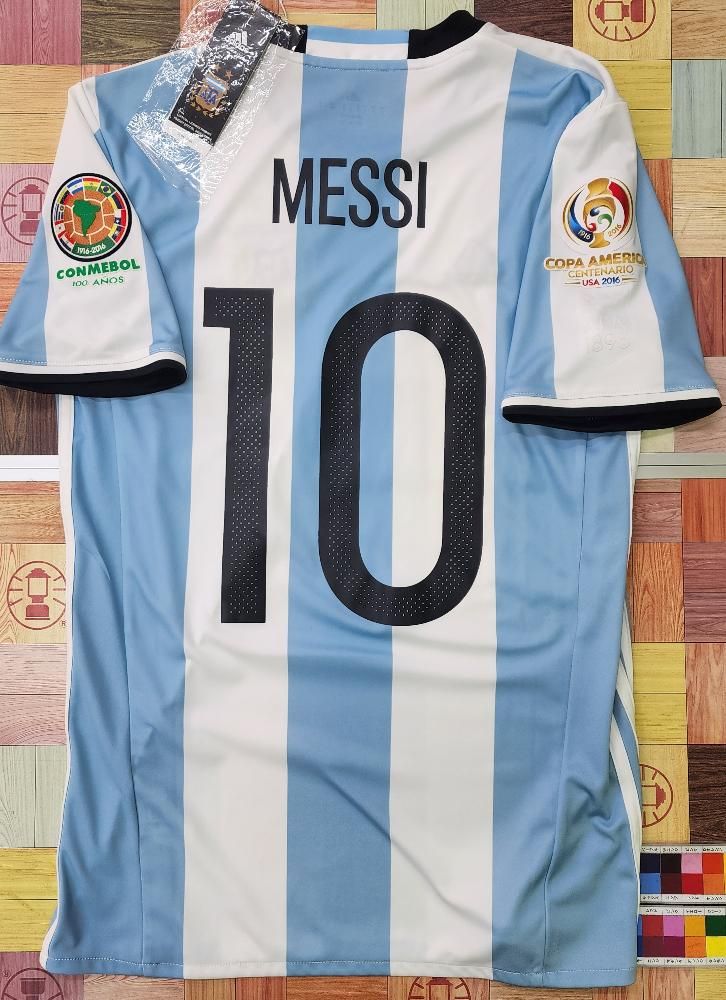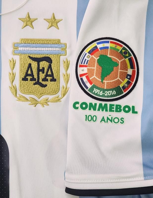 adidas社製 アルゼンチン(H)Copa America 2016 メッシ#10 +パッチ2個付き! 新品、未使用、紙タグ付きでございます! 背番号、胸番号はピンホールメッシュになっております。 右袖にAFAのクレストが浮き上がりの加工で描かれており。その上に COPA AMERICA2016USAの布生地のパッチ付きでございます。 左袖に立体フロック素材のCOMMEBOL 100周年パッチ付きでございます。 右胸のadidasロゴも左胸のAFAクレスト共に刺繍になります。